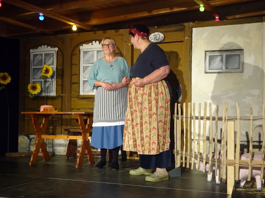 Im Vorfeld geriet unsere Zuversicht jedoch ins Schwanken, denn  zwei Schauspielerinnen wurden krank, sodass wesentliche Rollen durch sie nicht besetzt werden konnten. Aber kurzfristig erklärten sich andere Mitspielerinnen bereit, diese Rollen noch zu übernehmen. Teils in Doppelrolle und mit zusätzlich zeitnahem Rollenlernen konnten die Lücken so neu besetzt werden. Danke dafür.
